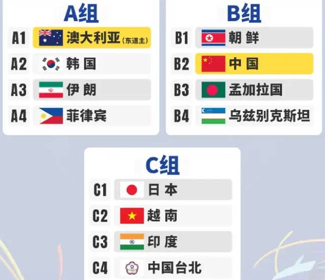 本届亚洲杯,中国女足身处竞争激烈的B组,同组对手包括朝鲜女足、孟加拉国女足和乌兹别克斯坦女足。其他小组的形势也同样引人关注:A组由东道主澳大利亚女足领衔,韩国女足、伊朗女足和菲律宾女足也在其中;C组则有日本女足、越南女足、印度女足和中国女足(此处应为中国台北女足,原文有误)。